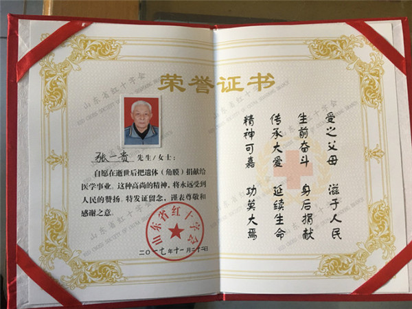 “我觉得身体不行了,抓紧联系市红十字会吧,把我的遗体和眼角膜捐献出去,为社会做些贡献。”这是75岁的退休老人张一贵去世前两天对儿女们说的话。11月21日19:30,老人安详平静地走完了他的一生,遵照老人的遗愿,家人将其遗体和眼角膜捐献给了山东大学齐鲁医院。